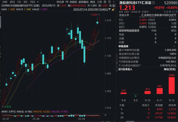 100%纯度的港股通科技ETF汇添富(520980)涨近1%冲击七连涨,盘中成交额已超4亿元!资金面上,近5日有4日获资金青睐,累计净流入超4300万元,最近20日更是大举吸金超5.17亿元,最新规模超37亿元同类持续领先!