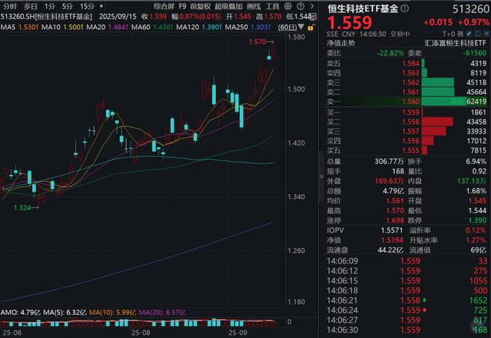 今日(9.15)招财猫配资,港股科技再度反攻,同类唯一15BP最低档管理费的恒生科技ETF基金(513260)涨近1%冲击七连涨,成交额已逼近5亿元,盘中持续溢价,近10日累计“吸金”超2.3亿元,最新规模超68亿元,再度刷新上市以来新高!基金融资余额继续维持1.7亿元以上高位!