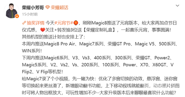 【CNMO科技消息】近日,荣耀产品维护与升级“荣耀小芳哥”发文称,荣耀Magic8已推送元宵版本更新,为用户增添节日仪式感。